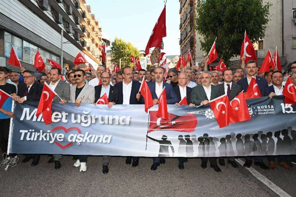 BURSA (İGFA) Bursa Valiliği’nin koordinasyonunda Bursa Büyükşehir Belediyesi tarafından düzenlenen 15 Temmuz Demokrasi ve Milli Birlik Günü etkinlikleri kapsamında bayrak yürüyüşü düzenlendi. Atatürk Heykeli önünden başlayıp 15 Temmuz Demokrasi Meydanı’nda sona eren yürüyüşe, Bursa Büyükşehir Belediye Başkanı Alinur Aktaş’ın yanı sıra Vali Yakup Canbolat, Bursa Milletvekilleri Refik Özen, Mustafa Esgin, Osman Mesten, Atilla Ödünç, Ahmet Kılıç, AK Parti İl Başkanı Davut Gürkan, AK Parti MKYK üyesi Ayhan Salman, ilçe belediye başkanları, siyasi parti temsilcileri, askeri erkân katıldı. Büyük bir coşkunun yaşandığı yürüyüşte, vatandaşlar ellerindeki Türk Bayraklarıyla ‘’Şehitler ölmez, vatan bölünmez” sloganları attı. Yoğun katılımın olduğu etkinlikte, Büyükşehir Belediye Bandosu’nun ve Mehter Takımı’nın marşlarıyla coşku doruğa çıktı. Büyükşehir Belediyesi tarafından hazırlanan 120 metrelik dev bayrak da vatandaşların ellerinde Demokrasi Meydanı’na getirildi.