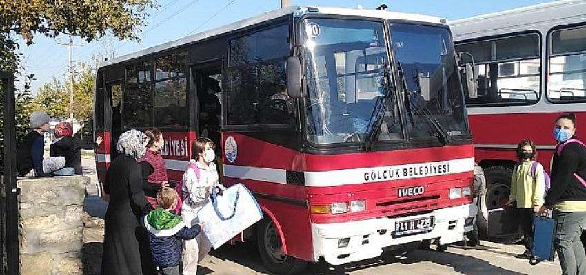 Gölcük Belediyesi, ihtiyacı karşılayamadığı için yıkılan Fidanlık İlkokulu öğrencilerini otobüslerle eğitim görecekleri okula taşıyor.