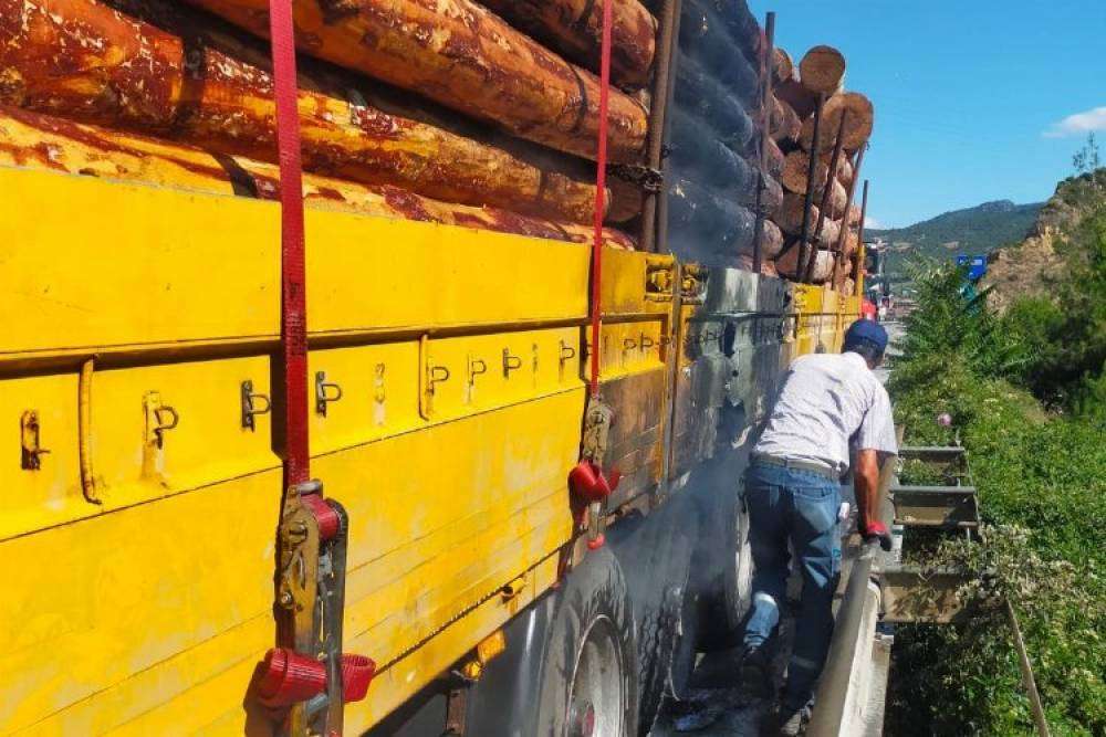 Bilecik'in girişinde seyir halinde olan tomruk yüklü tırın arka lastiklerden birinin alev alması sonucu yangın çıktı.Pazaryeri Gündem / BİLECİK (İGFA)- Bilecik girişinde tomruk yüklü çekici tırın arka lastiklerinden birinin alev alması sonucu yangın çıktı.