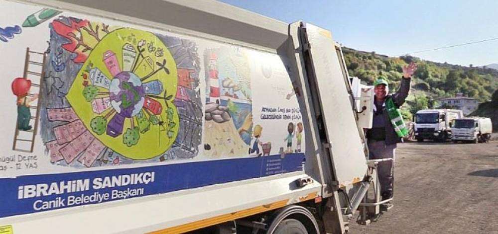 Canik Belediyesi tarafından iklim değişikliğine, küresel ısınmaya, çöp körlüğüne, çevre temizliğine dikkat çekmek ve bu konularda çocukların bilinçlenmesini sağlamak amacıyla düzenlenen Çocuk Gözünden Sıfır Atık ve İklim Değişikliği Resim Yarışması’nda dereceye giren eserler belediye temizlik işleri müdürlüğü araçlarında sergilenmeye başladı.