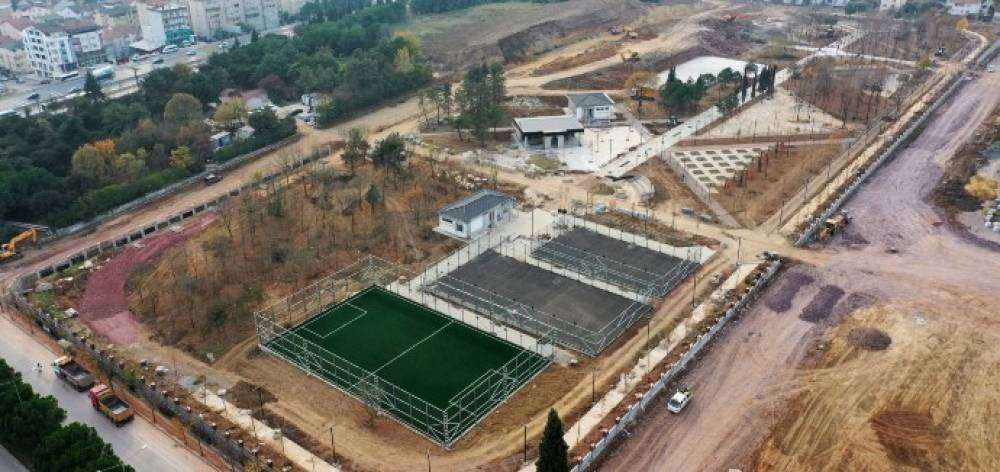 Diğer spor alanlarında da yoğun bir çalışma içerisinde olan Büyükşehir ekipleri, bu kapsamda çelik imalatlarını tamamladığı futbol sahasının zeminine sentetik suni çim serdi. 150 metrekare alanda inşa edilen spor sahaları idari binasının kaba imalatını tamamlayan ve ardından iç imalatlara geçen ekipler, park içerisindeki ara yürüyüş yollarının granit ve bazalt küptaş imalatlarını da büyük oranda tamamladı. Proje kapsamında 3 basamaklı amfi imalatını tamamlayan ekipler, ana aksın traverten bordür ve taban tuğla imalatını ise sürdürüyor.