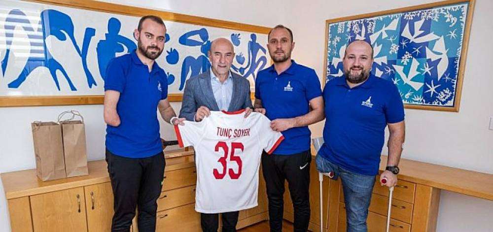 Dünya Kupası’nı kazanan Ampute Futbol Milli Takımı’nın ve İzmir Büyükşehir Belediyesi Gençlik ve Spor Kulübü’nün kalecisi Erdi Arslan Başkan Tunç Soyer’i ziyaret ederek yaşadığı mutluluğu paylaştı.