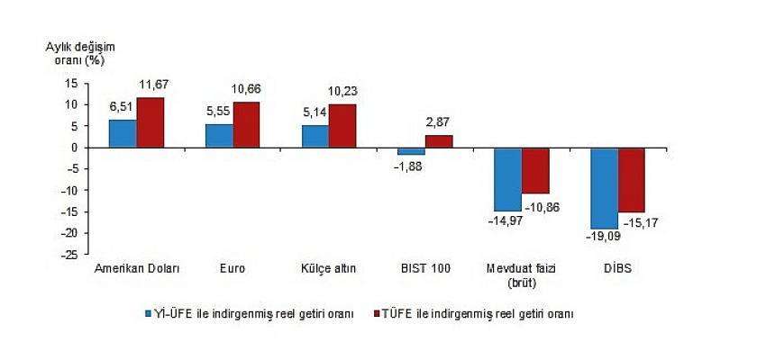 Yİ-ÜFE ile indirgendiğinde; yatırım araçlarından Euro 5,55 ve külçe altın 5,14 oranlarında yatırımcısına kazandırırken; BIST 100 endeksi 1,88, mevduat faizi (brüt) 14,97 ve Devlet İç Borçlanma Senetleri (DİBS) 19,09 oranlarında yatırımcısına kaybettirdi. TÜFE ile indirgendiğinde ise Euro 10,66, külçe altın 10,23 ve BIST 100 endeksi 2,87 oranlarında yatırımcısına kazandırırken; mevduat faizi (brüt) 10,86 ve DİBS 15,17 oranlarında yatırımcısına kaybettirdi.