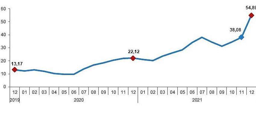 H-ÜFE (2017=100) 2021 yılı Aralık ayında bir önceki aya göre 12,81, bir önceki yılın Aralık ayına göre 54,89, bir önceki yılın aynı ayına göre 54,89 ve on iki aylık ortalamalara göre 32,54 artış gösterdi.