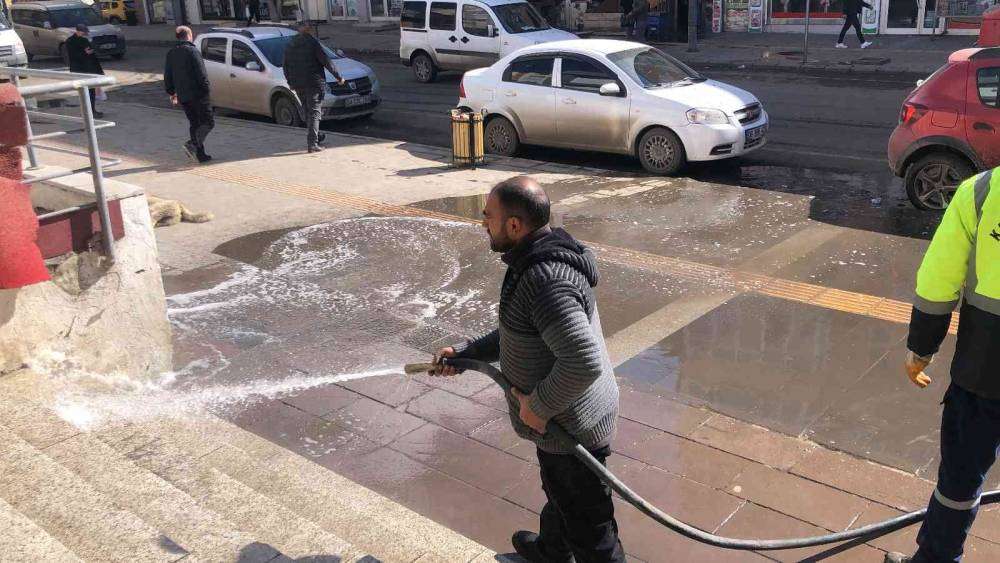 Kars’ta cadde ve kaldırımlar tazyikli suyla yıkanıyor.