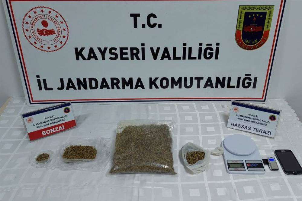 Kayseri Jandarma Komutanlığı KOM Şube Müdürlüğü ve Kocasinan İlçe Jandarma Komutanlığı ekiplerince uyuşturucu veya uyarıcı madde ticareti yapan şahısların yakalanmasına yönelik yapılan araştırma ve çalışmalar sonucunda elde edilen bilgiler doğrultusunda; Talas'ın Mevlana Mahallesi'nde şüpheli (L.K.) isimli şahsın ev ve aracında, Kayseri Cumhuriyet Başsavcılığı'ndan alınan arama kararı gereğince, Narkotik köpek timi eşliğinde yapılan arama neticesinde; Yaklaşık (1.021) gr. bonzai uyuşturucu maddesi olduğu değerlendirilen madde ve 2 adet hassas terazi ele geçirildi. Şüpheli gözaltına alındı.