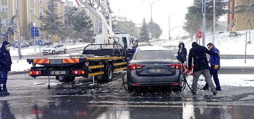 İzmit ilçesi Kurtuluş Bulvarında seyir halinde olan araç, kar yağışı nedeniyle sürücüsünün direksiyon hakimiyetini kaybetmesi sonucu bariyerlere çarptı. Aracı kullanan anne ve çocuğun yardımına Kocaeli Büyükşehir Belediyesi Zabıta ekipleri koştu. Büyükşehir zabıtası, kaza yapan araç sürücüsü anneye yardımcı olurken, küçük çocuğu da soğuk havada üşümemesi için kendi araçlarına aldı.