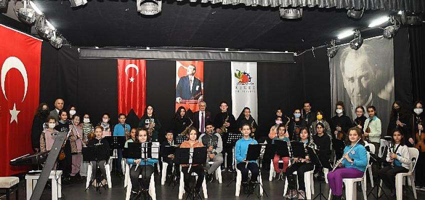 Kemer Belediyesi Kültür Salonunda Şef Furkan Üstündağ ve orkestradaki çocuklar, Belediye Başkanı Topaloğlu’na küçük bir konser verdi.