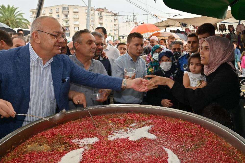 Aşure dağıtımı öncesinde eller semaya açılarak dualar edildi. Bolluk ve bereketin simgesi olan aşure dağıtımı öncesinde Manisa Büyükşehir Belediye Başkanı Cengiz Ergün de kısa bir konuşma yaptı.