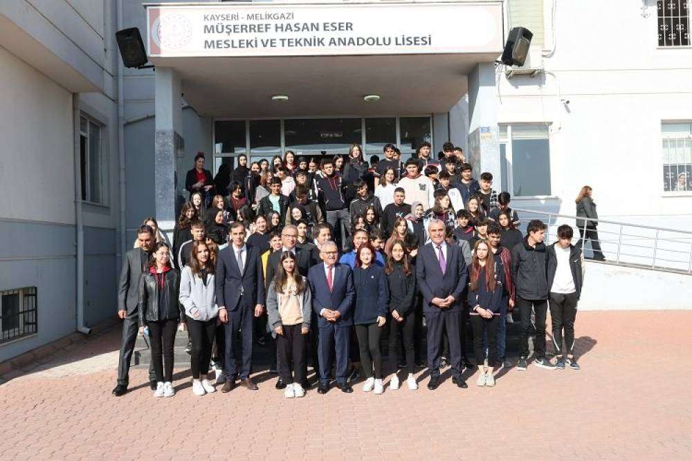 Kariyer Günleri kapsamında Müşerref Hasan Eser Mesleki ve Teknik Anadolu Lisesi’nde gençlerle buluşan Başkan Büyükkılıç’ı okul girişinde İl Milli Eğitim Müdürü Ayhan Teltik ve Melikgazi İlçe Milli Eğitim Müdürü Hacı Kaya ile okul yönetimi ve öğrenciler çiçeklerle karşıladı.