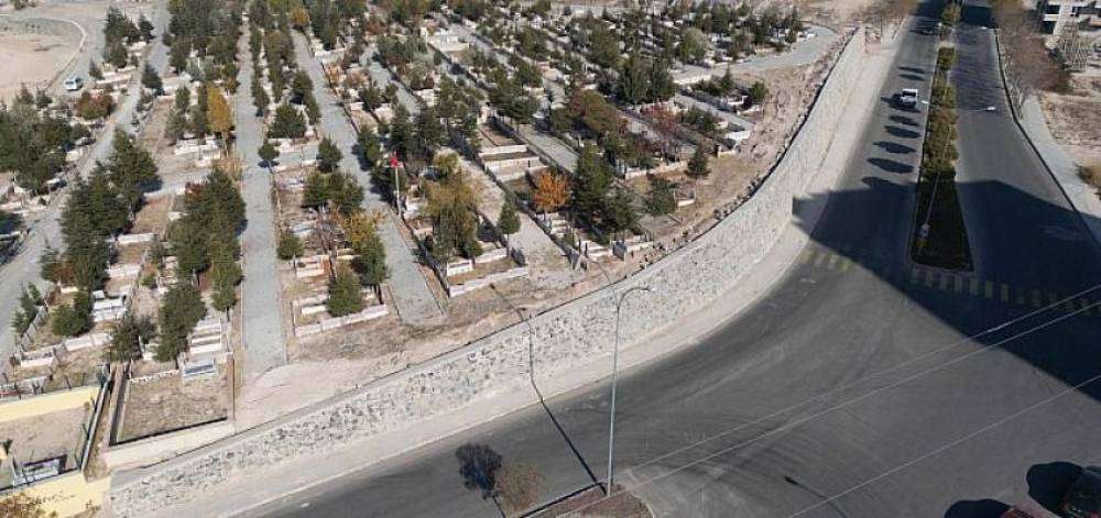 Nevşehir Belediyesi tarafından Kaldırım Mezarlığı’ndaki iki ayrı noktada başlatılan istinat duvarı yapım çalışması sürüyor.