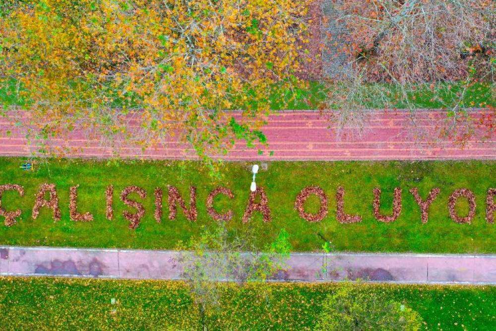 Kentte sonbaharla birlikte farklı tonlara bürünen ağaçlar görsel şölen sunuyor. Sarı, kahverengi ve yeşilin farklı tonlarına bürünen ağaçlar, kartpostallık görüntüler ortaya çıkarıyor. Düzenli olarak parklarda, mesire alanlarında ve yol kenarlarında bakım ve temizlik çalışması yapan Park ve Bahçeler ekipleri, topladıkları yapraklardan estetik bir çalışmaya imza attı. Topladıkları binlerce yaprağı sabırla dizen ve bunlardan ‘Mutlu Şehir Kocaeli’ ve ‘Çalışınca Oluyor’ yazıları oluşturan ekiplerin çalışması sonuç verdi. Havadan görüntülenen yazılarla yapraklar adeta dile geldi.